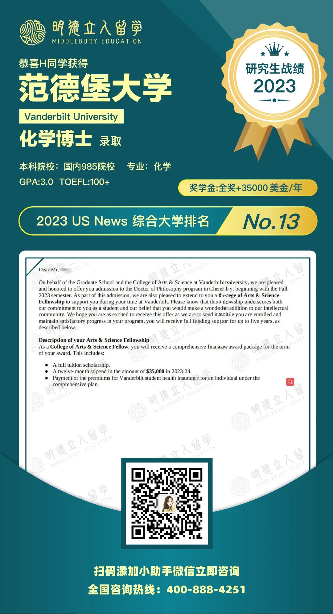 斩获全美综排Top 13的范德堡大学,化学博士项目Offer,不仅学费全免,更有3.5万美金/年的生活补助!