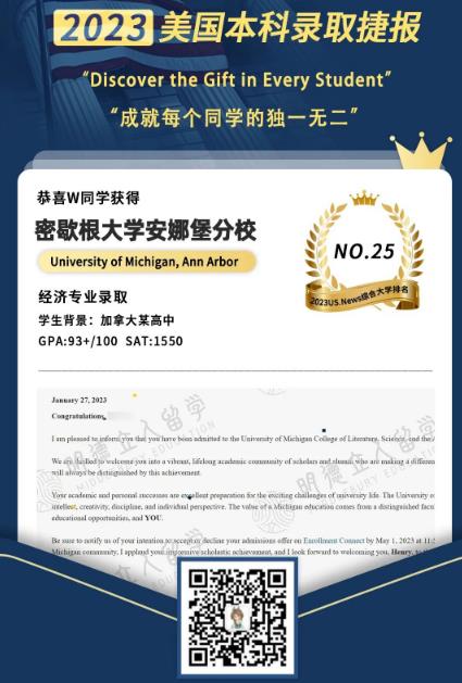 祝贺W同学喜提密歇根大学安娜堡分校经济专业Offer!