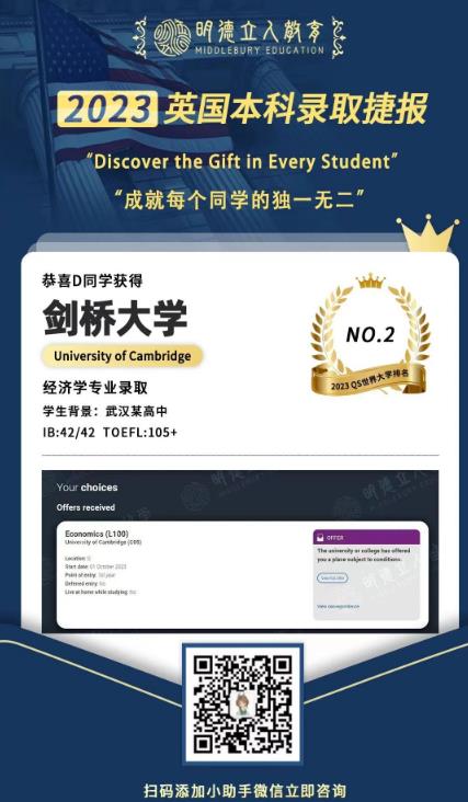 D同学武汉某高中IB:42/42TOEFL:105+录取专业:经济学专业录取学校:剑桥大学