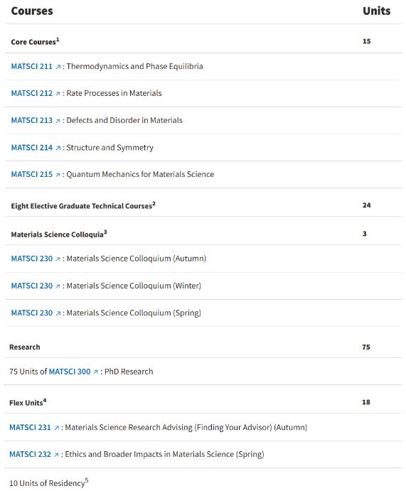 在博士课程的第一年,学生须从核心课程中选修五门课程,参加每周的座谈会讲座,了解前沿材料科学研究,探索寻找顾问(包括每周的课程时间),并报名参加一些技术选修课程。