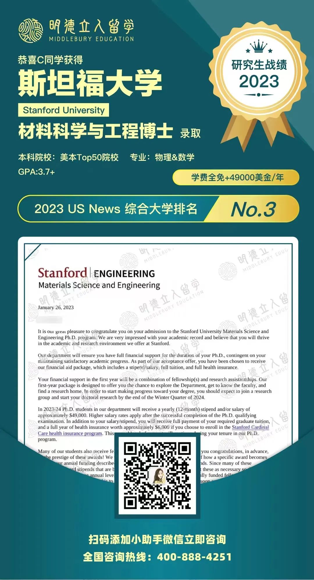 综排全美Top 3 ,专排世界Top 2 的斯坦福大学材料科学与工程博士项目Offer,不仅学费全免,还有4.9万美金/年的生活补助!