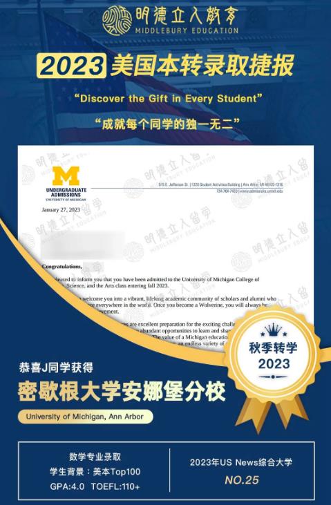 密歇根安娜堡每年都是大家转学申请的热门选择,近些年很多明德学员都收到了该校的转学录取通知。