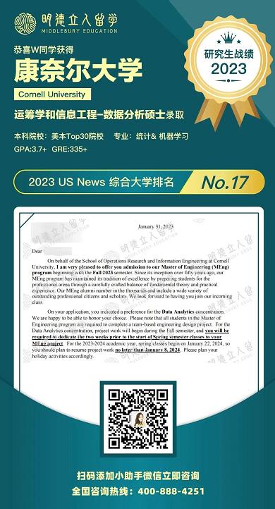 让我们恭喜明德学子W同学,丝滑地斩获难度很高的藤校康奈尔大学的数据分析硕士项目Offer!