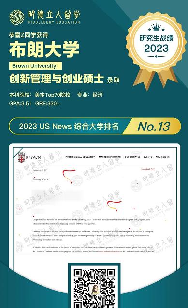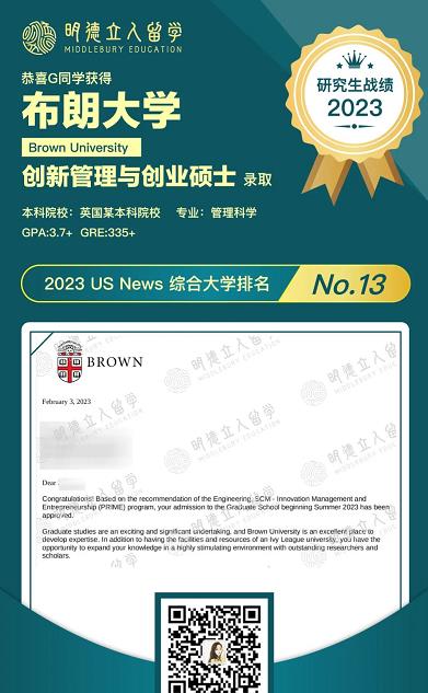 恭喜明德学子H同学、Z同学和G同学,全部成功斩获布朗大学(#13)的创新管理与创业硕士(PRIME)项目Offer!