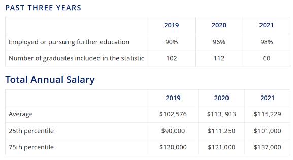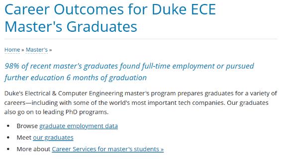 在就业方面,依托杜克大学优秀的地理位置和学校声誉,该项目毕业生在毕业6个月后就业率高达98%!