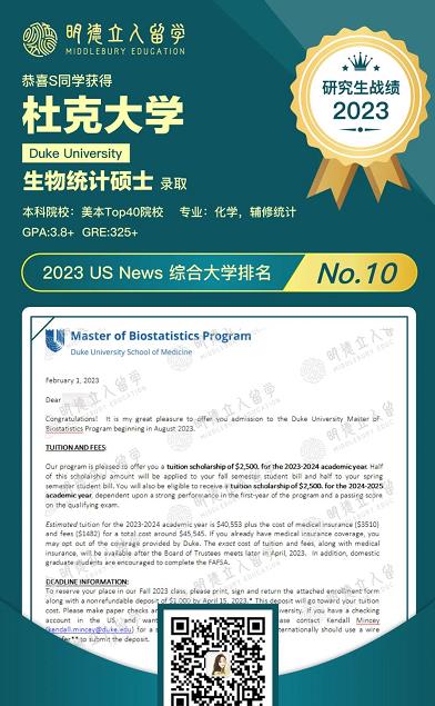 明德学子S同学则在收获约翰霍普金斯大学(JHU)的商业分析(BA)项目,与密歇根安娜堡的生物统计项目录取后,又拿下了杜克大学的生物统计硕士项目Offer!