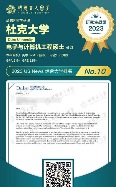 恭喜明德学子P同学斩获全美综排Top10的杜克大学(Duke)的电子与计算机工程(ECE)硕士项目Offer;