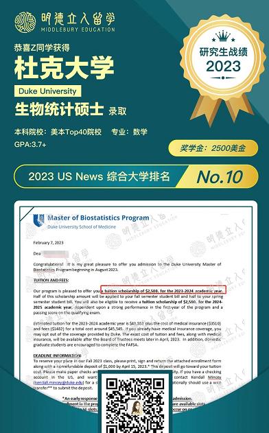 是的,还是“南方哈佛”——杜克大学。 继昨天的P同学和S同学后,Z同学也收到了杜克大学的入场券! 恭喜明德学子Z同学斩获全美综排Top10的杜克大学(Duke)的生物统计硕士项目Offer,还有2500美金/年的奖学金哦! Z同学此前还拿到了密歇根安娜堡-生物统计(专排4)和埃默里大学-生物统计(专排11)硕士项目offer~