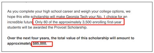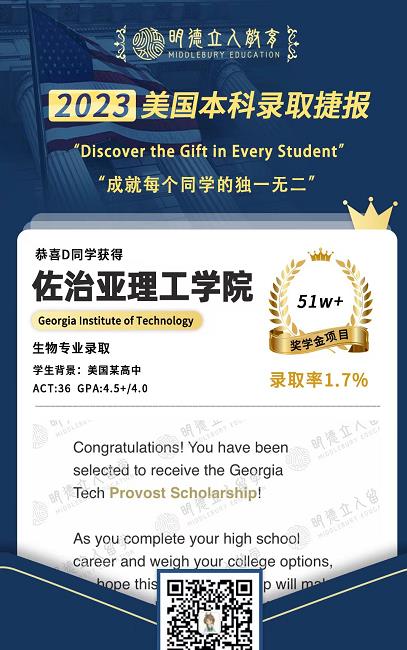奖学金在约3500名新生中,只有60人能得,录取率1.7%,看了佐治亚理工对D同学的整个申请形象是非常喜欢,才会给到这么稀缺的名额!