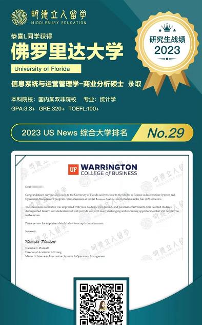 恭喜明德学子L同学,以3.3+的GPA成绩,依靠出色的选校策略与实习规划,成功逆袭全美Top29名校,拿到佛罗里达大学的信息系统管理学(ISOM)硕士项目Offer!
