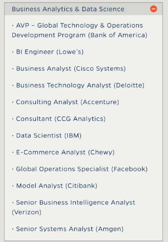 该课程包括统计,分析和信息系统课程,使毕业生能够在各行各业担任业务分析师,包括咨询,营销和金融公司。
