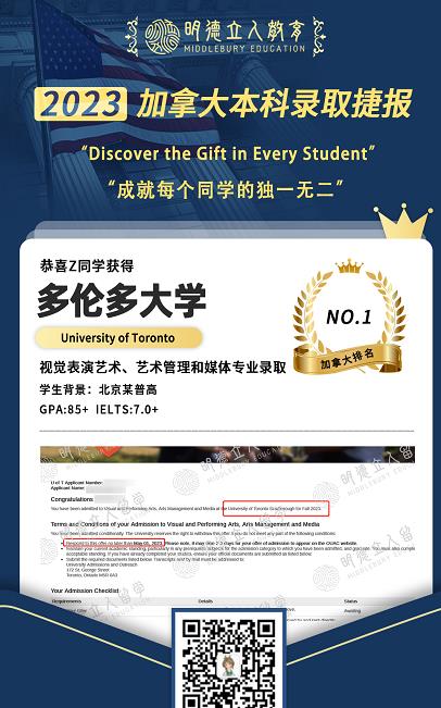 Z同学北京某普高GPA:85+IELTS:7.0+录取专业:视觉表演艺术、艺术管理和媒体专业录取学校:多伦多大学