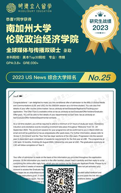 Y同学本科成绩突出,科研实习均满足基本申请要求。而传媒申请非常重视文书,尤其是LSE&USC的双学位项目更是出了名的对文书严苛。