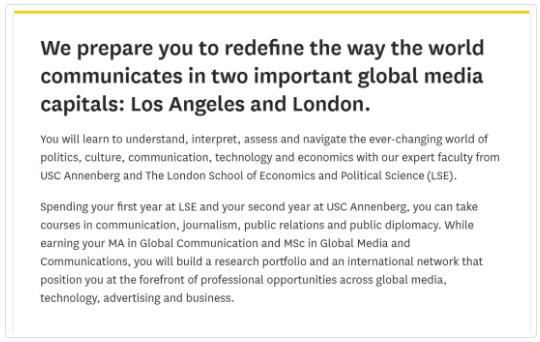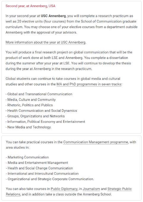 该项目的学生在伦敦政治经济学院度过第一年,在南加州大学度过第二年。通过在两个院校学习传播、新闻、公共关系和公共外交等课程,学生不仅可以获得全球传播硕士学位和全球媒体与传播硕士学位,还可以在全球媒体、技术、广告和商业领域都得到广泛的涉猎和学习。