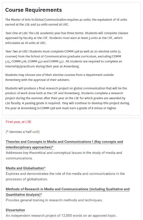全球传播文学硕士需要42个学分,即在 LSE 获得的18个学分和在 USC 获得24个学分。具体内容如下: