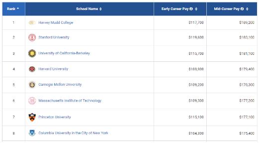 其中哥大以$104,300的早期薪资,以及$175,400的中期薪资排名全美TOP8,“搞钱能力”着实出众!