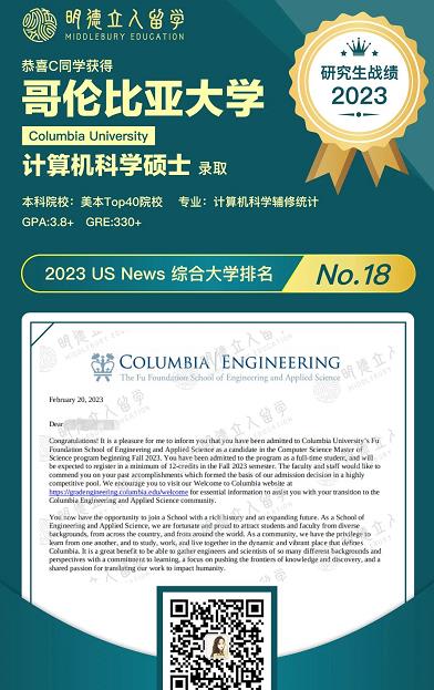 恭喜明德学子C同学斩获哥大计算机科学硕士offer!同样也是一个高薪专业~C同学未来可期哦!!