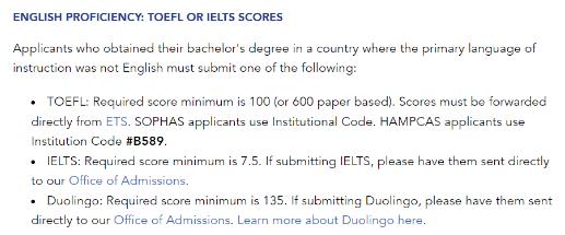 最低成绩:托福100/雅思7.5