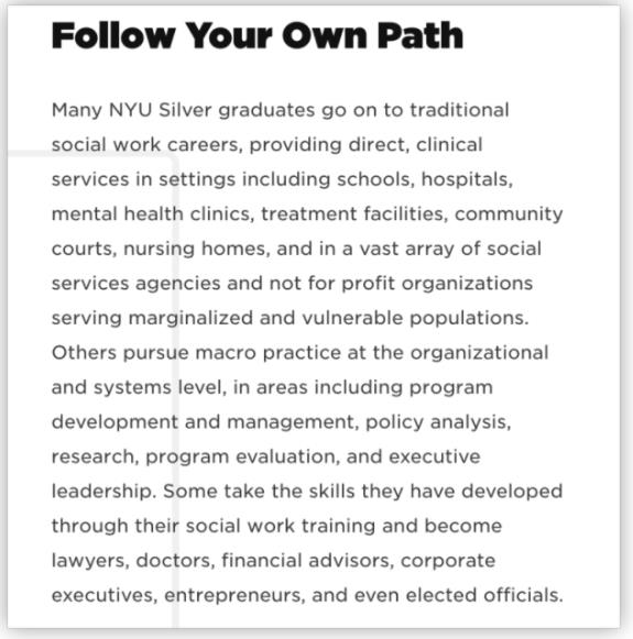 而另外一部分在组织和系统层面进行宏观实践,包括项目开发和管理、政策分析、研究、项目评估和执行领导。有些人利用他们在社会工作培训中培养的技能,成为律师、医生、财务顾问、公司高管、企业家,甚至官员。