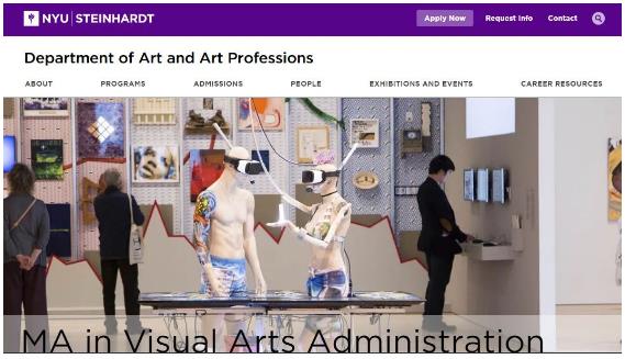 视觉艺术管理硕士课程是美国第一个专注于传统和替代背景下的视觉艺术管理职业课程。该项目为两年制项目,允许学生跨院系选课,包括商学院 (the Stern School of Business) 和公共学院 (the Wagner School of Public Service) 的管理课程。