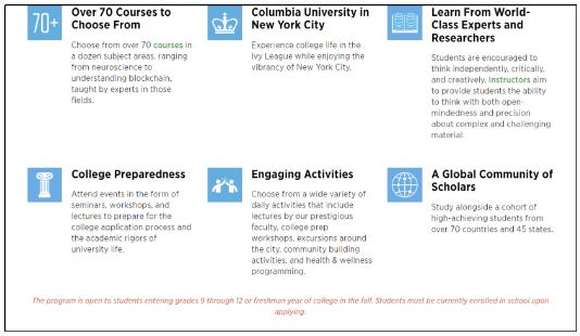 参与的学生可以与来自70多个国家、地区和45个州的学生一起学习。结课后可获得哥大的证书和教授推荐信。