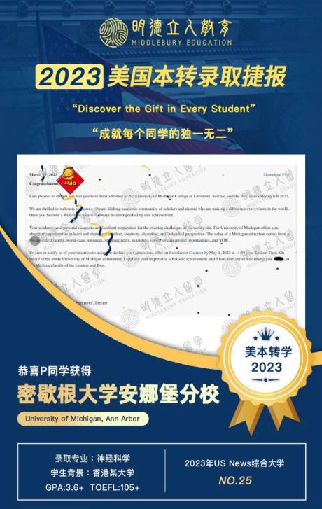 包括P同学在内,截至目前,我们今年已经有8位明德学员斩获了密歇根大学安娜堡分校的转学offer: