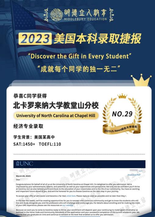 同时也拿到了被誉为“公立常春藤”和“新常春藤”的北卡教堂山分校经济专业录取!