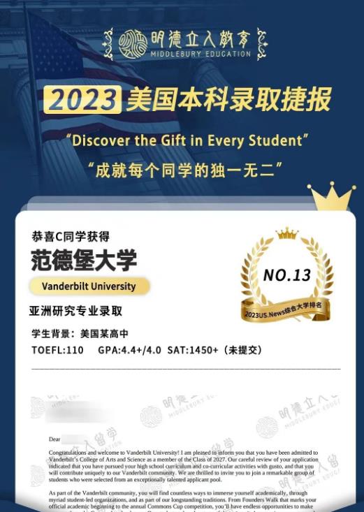 恭喜C同学录取北卡教堂山之后拿到Top13范德堡录取!