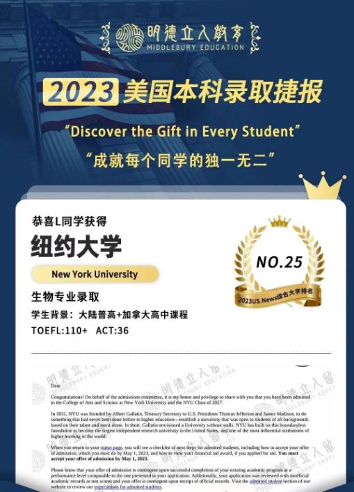 注:本次共有2位明德学员获得了纽约大学的录取,其中有一位学员不方便透露信息,故仅展示1位录取学员的信息。