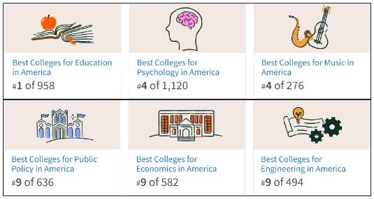 经济、商业、历史、教育、心理学等专业全美顶尖,不仅有超好的教育质量,学生幸福指数也非常高。