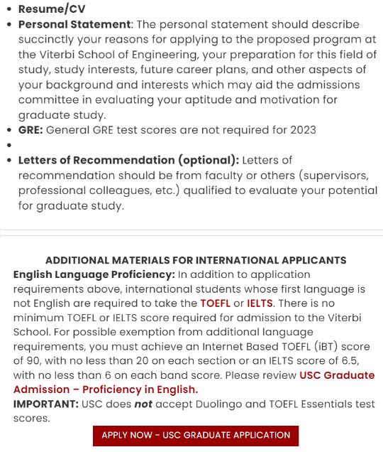 申请要求如下,如果是国际申请生,需要提供语言成绩,但注意不接受Duolingo 和 TOEFL Essentials 考试成绩。