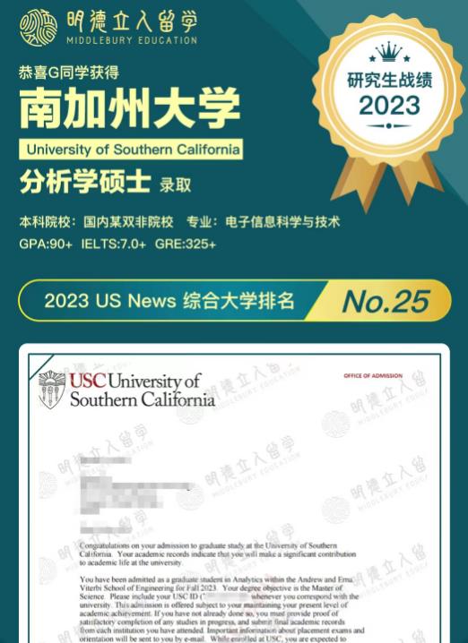 恭喜明德学子G同学从陆本双非成功进阶拿下全美T25USC分析学硕士!