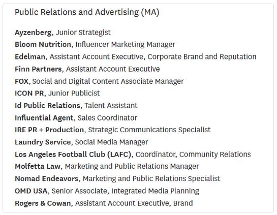 以下是一些 2021 届公共关系与广告 (MA) 校友的就业方向,包括初级战略家、公关人员、市场营销和公共关系经理等。