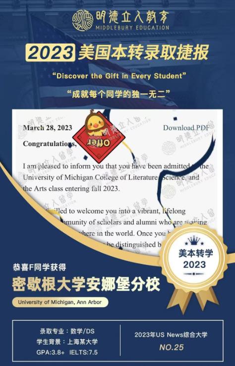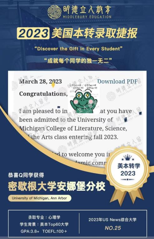 T25 密歇根大学安娜堡分校数学、心理学offer!!!明德已收获10枚Umich转学offer!!