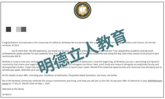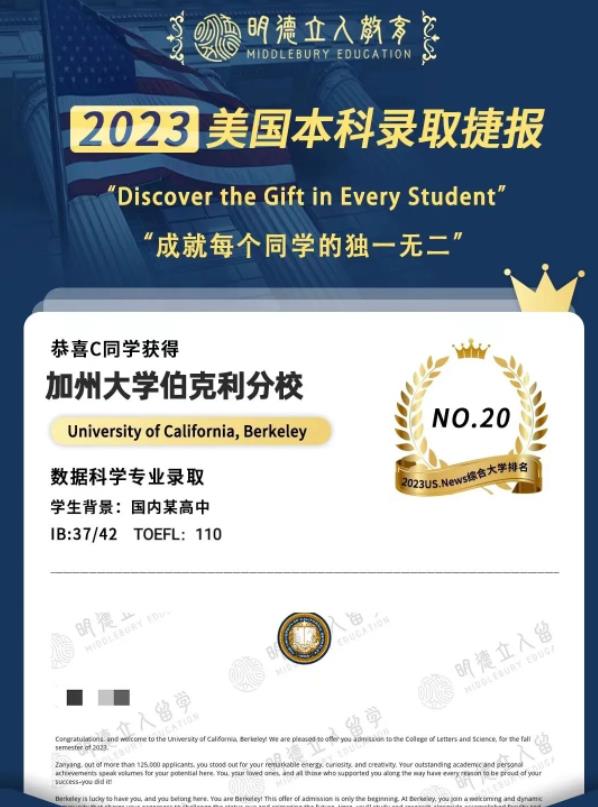 注:共有2位明德学员获得了加州大学伯克利分校的录取,其中有一位学员不方便透露信息,故仅展示了1位录取学生的信息。