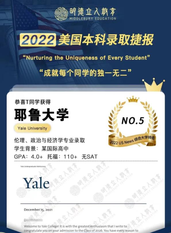 这已经是我们连续第二年斩获耶鲁大学的录取了,明德学员T同学2022年拿到的是该校的伦理、政治与经济学专业Offer。