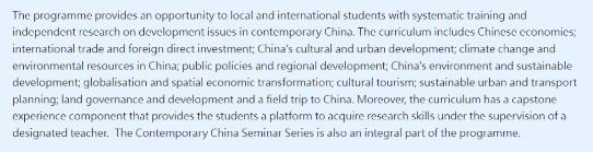 中国发展研究文学硕士课程强调通过全球和地方经济、贸易、投资、环境、政策制定、旅游和城市发展方面的区域差异全面了解中国。