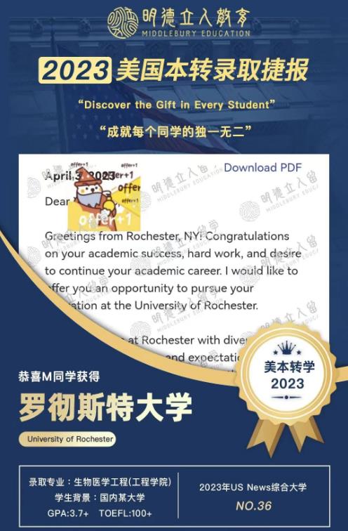 恭喜来自国内某大学的M同学斩获威斯康星麦迪逊大学和俄亥俄州立大学的转学Offer后,再次拿到Top36罗彻斯特大学工程学院的录取。M同学是大二转大三,以Ta的GPA和托福成绩申请工程学院是有很大劣势的。好在这个孩子去年9月份就找到明德立人咨询转学了,因为时间早,导师给M同学进行了详细且全面的背景提升规划。M同学本身也非常努力,对于导师制定的计划会按时完成,自己有不懂的问题也会及时跟导师交流和反馈。