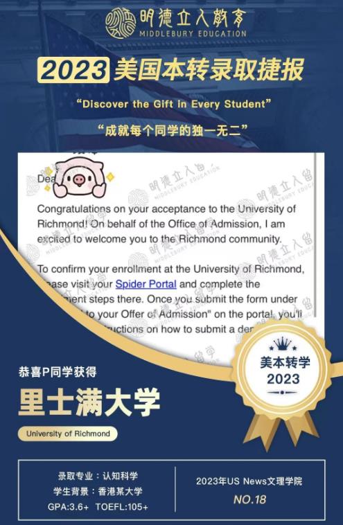 来自香港某大学的P同学在导师帮助下,前几周拿到了密歇根安娜堡的录取,今天再次斩获了里士满大学,集齐了公立牛校和文理学院双重Offer!