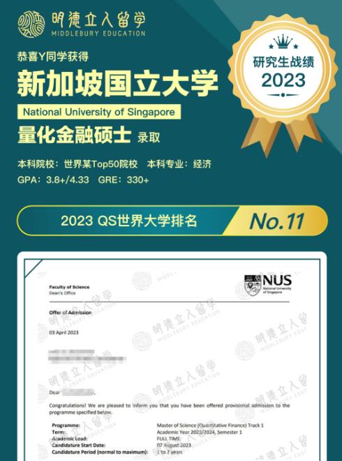 恭喜明德学子Y同学,顺利拿下新加坡国立大学量化金融硕士!