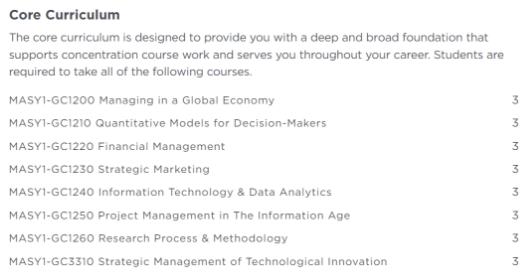 项目是一个42学分的课程,包括一套必需的7门核心课程,4门学生选择的集中课程和一门必需的Capstone course。