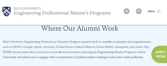 莱斯大学工程专业硕士课程的校友在著名的公司和组织工作,例如 NASA、谷歌、苹果、亚马逊、美国联邦储备委员会、埃克森美孚、Instagram 等。