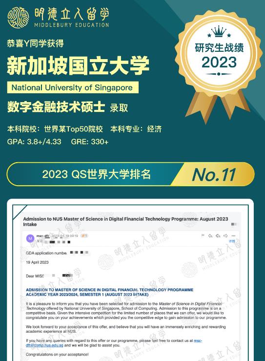 恭喜明德学子Y同学从世界TOP50,斩获世界TOP11新加坡国立大学数字金融技术offer!