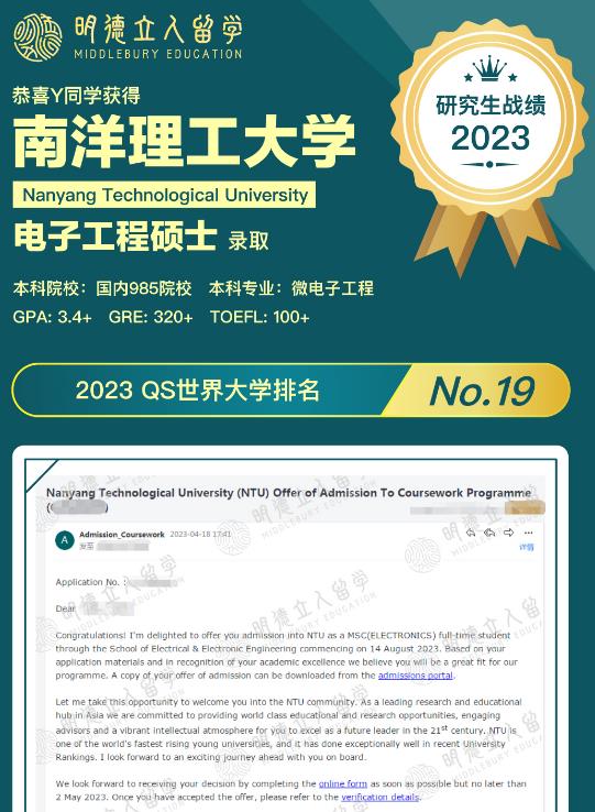 恭喜明德学子Y同学从陆本出发,拿下南洋理工大学电子工程硕士offer!