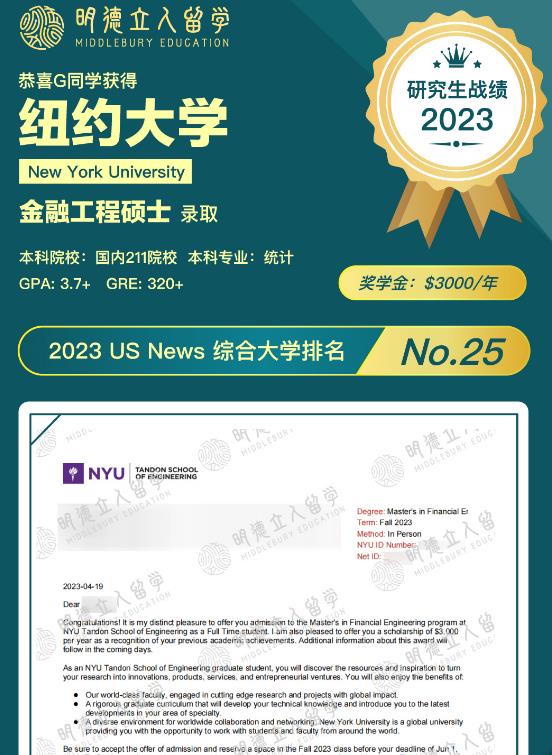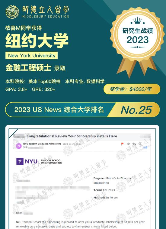 恭喜明德学子M同学从美本T60,成功进阶纽大金融工程,还有奖学金$4000/年
