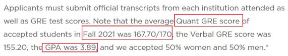 根据官网数据显示,2021年秋季录取的学生GRE量化平均分数为167.70/170,GRE口语平均分数为155.20,平均GPA则达到了3.89!