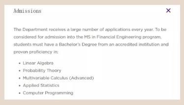 除此之外,申请者还必须具备线性代数、概率论、多变量微积分(高级)、应用统计学与计算机编程的相关知识。
