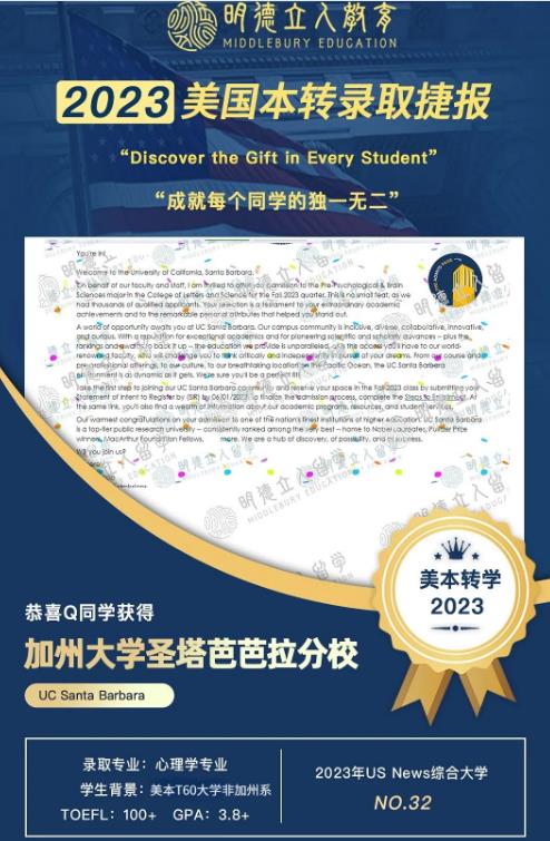 Q同学的录取难度也非常高,Ta来自非加州系的美本某Top60大学。对UC转学有过了解的学生或者家长都知道,加州大学对州内以及社区学院的学生有优待,录取学生中,加州的州内学生就占据了超90%的名额。如果不在加州州内就读,想要转学进入加州大学依然非常困难。难度高不一定就代表无法录取,只要精准规划就有希望!我们的Q同学就在导师的帮助下,在GPA、选课、活动和文书等各方面进行了提升和完善,最终以非加州系的学生身份进入了UCSB!