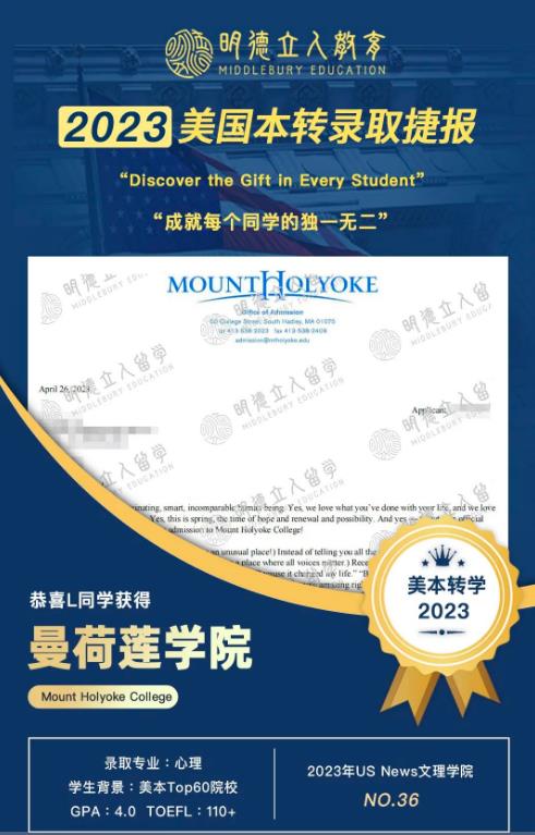 曼荷莲学院 Offer+1(2023US.News文理学院排名#36)