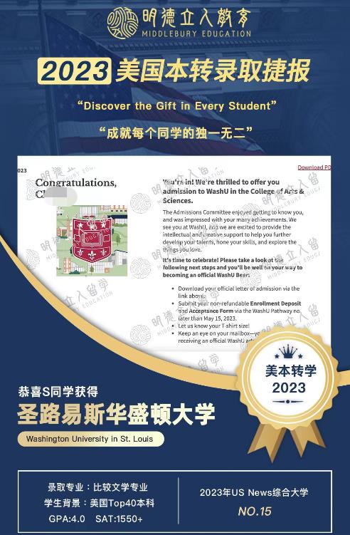 圣路易斯华盛顿大学Offer+1(2023US.News美国大学排名#15)